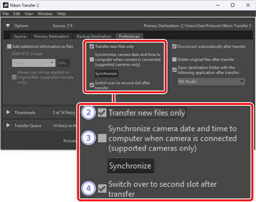 - Ladda ned bilder till den mapp som valts med [Primary destination folder (Primär destinationsmapp)], och använd sedan den mapphierarki och de mappnamn som används i kameran.