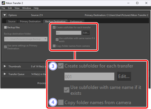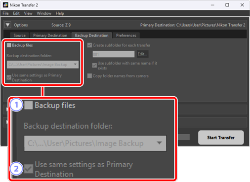 - [Choose subfolder under Primary Destination folder (Välj undermapp under primär destinationsmapp)]: Ladda ned bilder till en undermapp i den mapp som valts med [Primary destination folder (Primär destinationsmapp)]. Ange undermappens namn i slutet av sökvägen [Primary Destination (Primär destination)] överst i området med överföringsalternativ. Om den valda undermappen inte redan existerar skapas en ny undermapp med det valda namnet. Du kan också välja en undermapp, som du tidigare har använt, från rullgardinsmenyn.