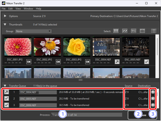 - En lista över filer som ska överföras och väntar på att laddas ned. En förloppsindikator och indikering av återstående tid visas samtidigt som varje bild laddas ned.