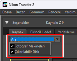 [Fotoğraf Makineleri] ve [Çıkarılabilir Disk] arasından [Kaynak] sekmesinde görüntülenen cihaz türlerini seçmek için [Ara] açılır menüsünü kullanın. Bu sekmede yalnızca seçilen türden cihazlar için düğmeler listelenecektir.