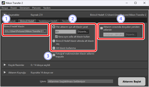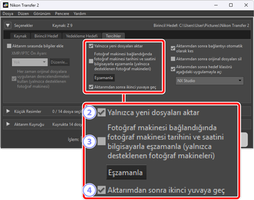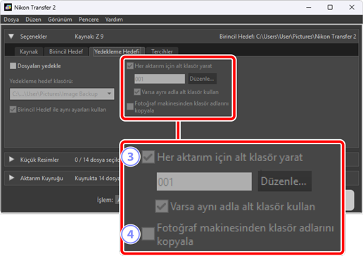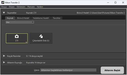 Kaynak cihazı seçme (resimlerin indirileceği cihaz) ve bir hedef klasör seçme dahil olmak üzere çeşitli görevler gerçekleştirin. [Seçenekler] bölmesi aşağıdaki sekmeleri içerir: [Kaynak], [Birincil Hedef], [Yedekleme Hedefi] ve [Tercihler].