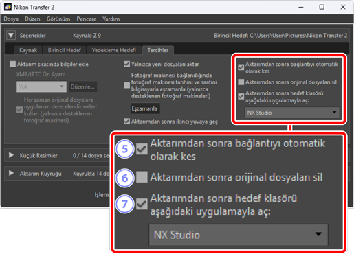 - İndirme işlemi tamamlandığında, dosyaları fotoğraf makinesinden veya hafıza kartından otomatik olarak silmek için bu seçeneği seçin. İndirme işlemine dahil olmayan veya fotoğraf makinesinde korumalı olarak işaretli dosyalar silinmeyecektir.