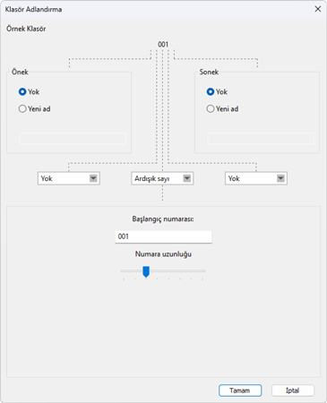 - Seçilen kurallarla oluşturulan adlara dair bir örnek, diyaloğun üst kısmındaki [Örnek Klasör] alanında görünür. Örnek, siz kuralları düzenledikçe otomatik olarak güncellenir.