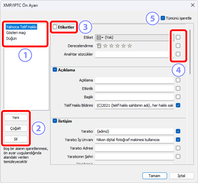 XMP/IPTC ön ayarlarını yönetmek için aşağıdaki seçenekler kullanılabilir.