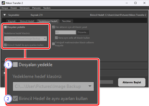 - İndirme sırasında resimlerin yedek kopyalarını oluşturmak için bu seçeneği seçin. Resimler [Yedekleme hedef klasörü] için seçilen klasöre kopyalanacaktır. Açılır menüden önceden kullanılan bir klasörü seçebilir veya [Tara] öğesine tıklayıp yeni bir klasör seçebilirsiniz.