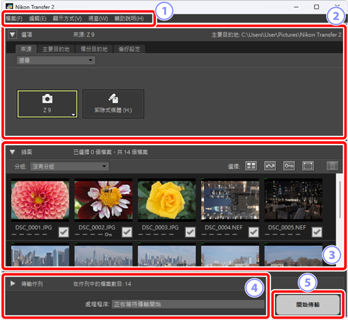 Nikon Transfer 2 視窗的部件如下圖所示。