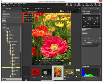 - 对于由数码相机拍摄的图像,ViewNX-i显示拍摄日期、相机型号、镜头、图像大小、文件大小、焦距、ISO 感光度、快门速度、光圈、曝光补偿、白平衡,以及XMP/IPTC信息中的“标题”、“说明”和“关键字”等信息。只显示包括信息的项目。