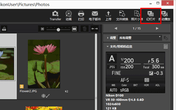 您可以在图像查看区域或胶片显示窗格中选择图像,并且以幻灯片的形式进行播放。若要进行幻灯片播放,需要安装ViewNX-Movie Editor。