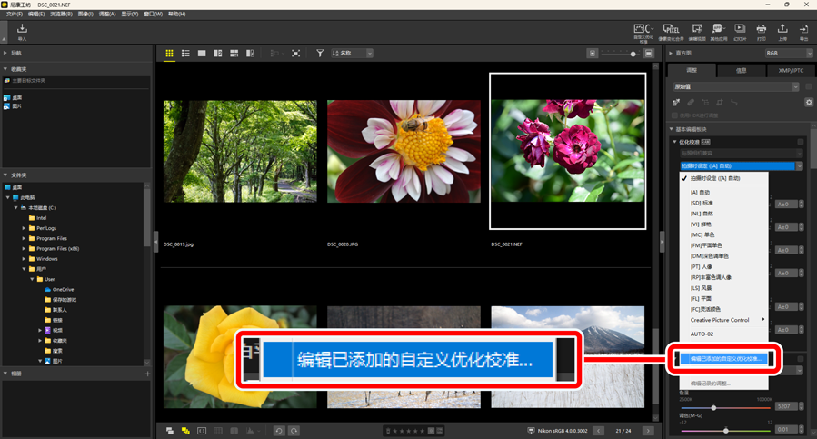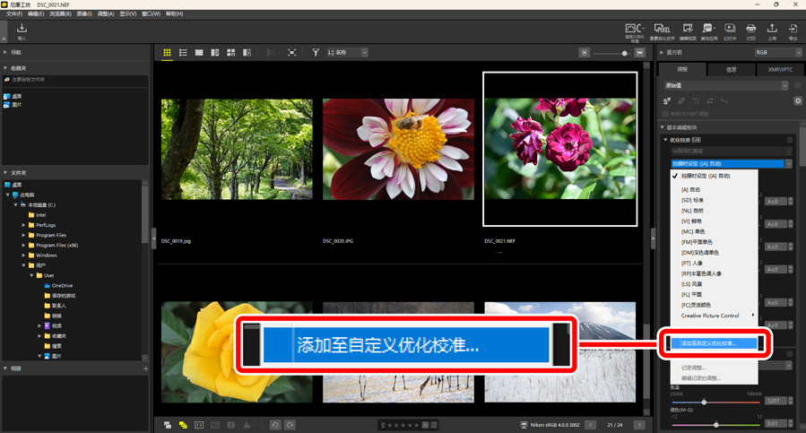 在尼康工坊中,可将在调整板块的[优化校准]中调整过的优化校准保存为自定义优化校准。通过从[优化校准]下拉菜单选择保存的自定义优化校准,可将其应用至图像。