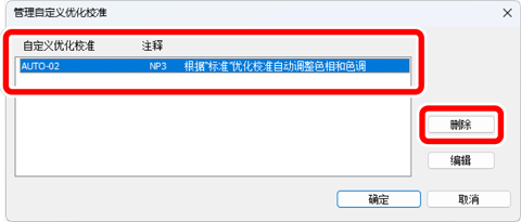 在[管理自定义优化校准]对话框中,选择一个自定义优化校准,然后单击[删除]。