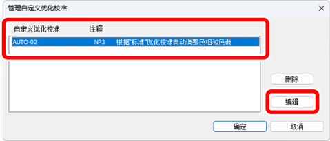 在[管理自定义优化校准]对话框中,选择一个自定义优化校准,然后单击[编辑]。
