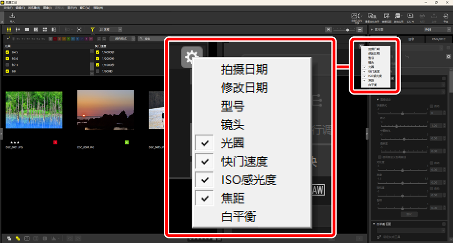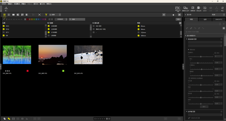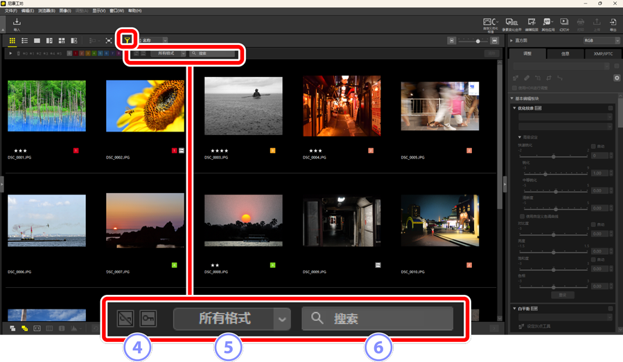 - 按文件名称或XMP/IPTC元数据中的关键字筛选照片。