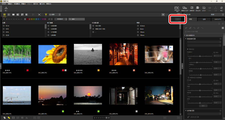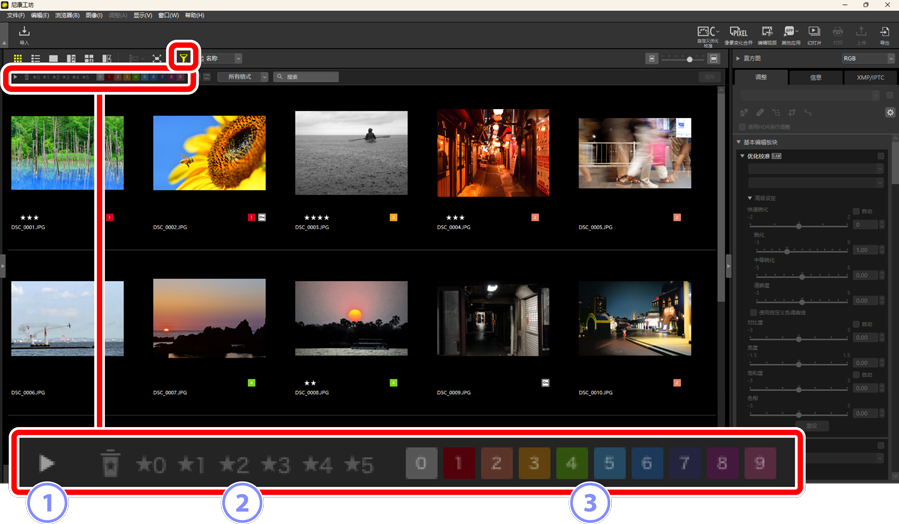 - 按评级筛选照片(0 为照片评级)。