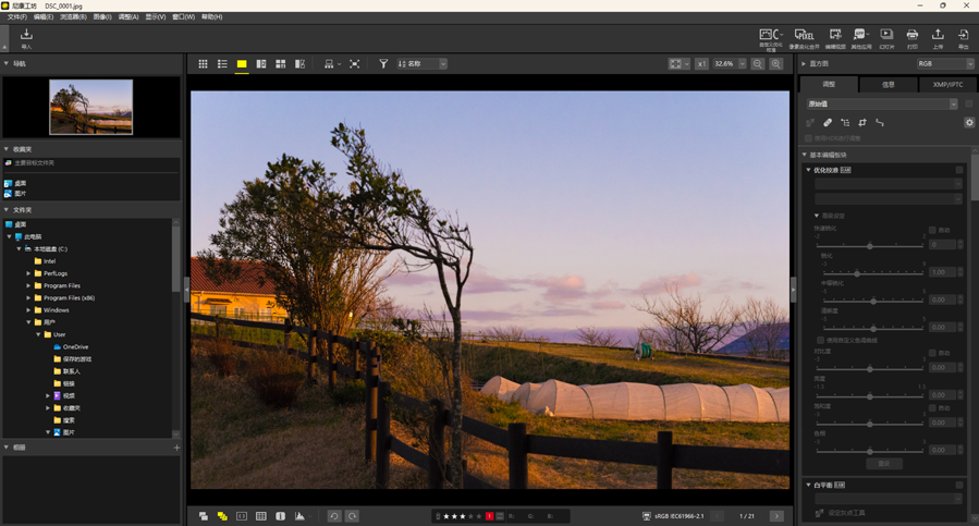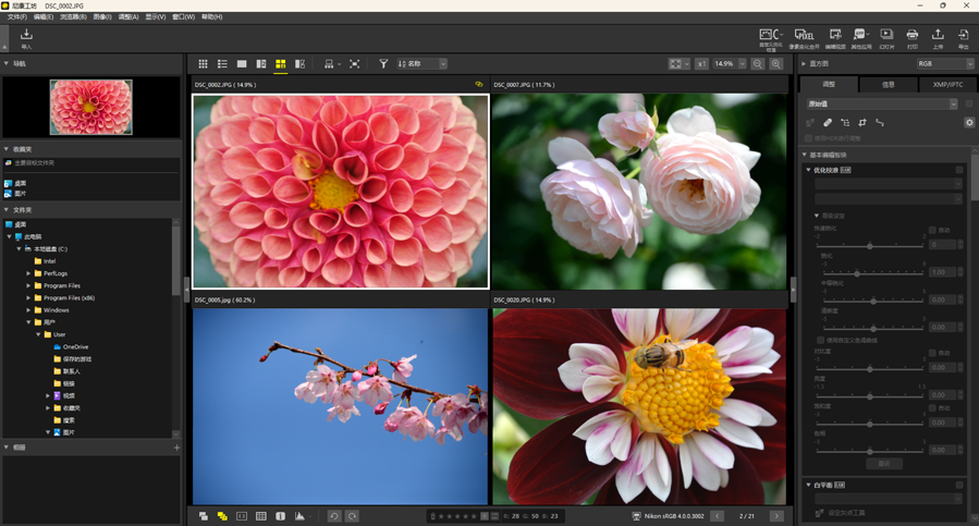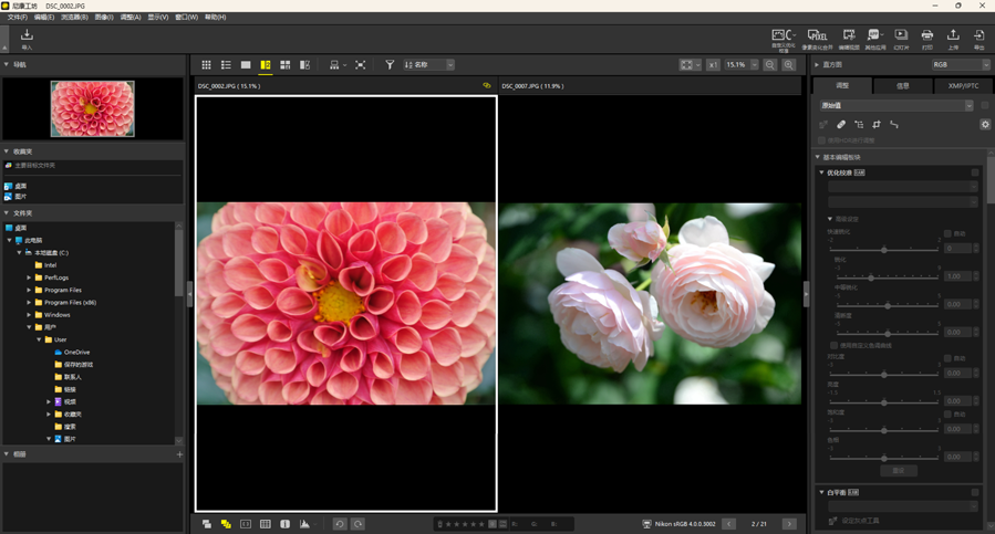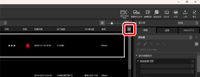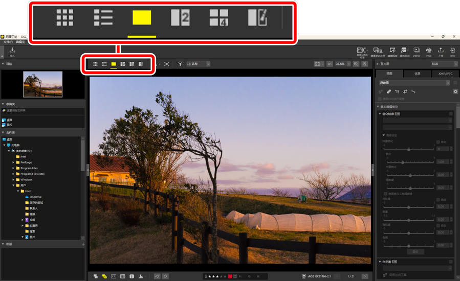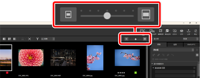 使用查看区域右上角的按钮可选择照片在图像查看器、“2/4张图像”和编辑前后对比视图中的显示尺寸。