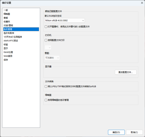 - 选择[将以JPEG/TIFF格式保存文件时配置文件转换为sRGB]可将sRGB色彩配置文件嵌入在导出过程中转换为其他格式的照片中。原有色彩配置文件会被覆盖。