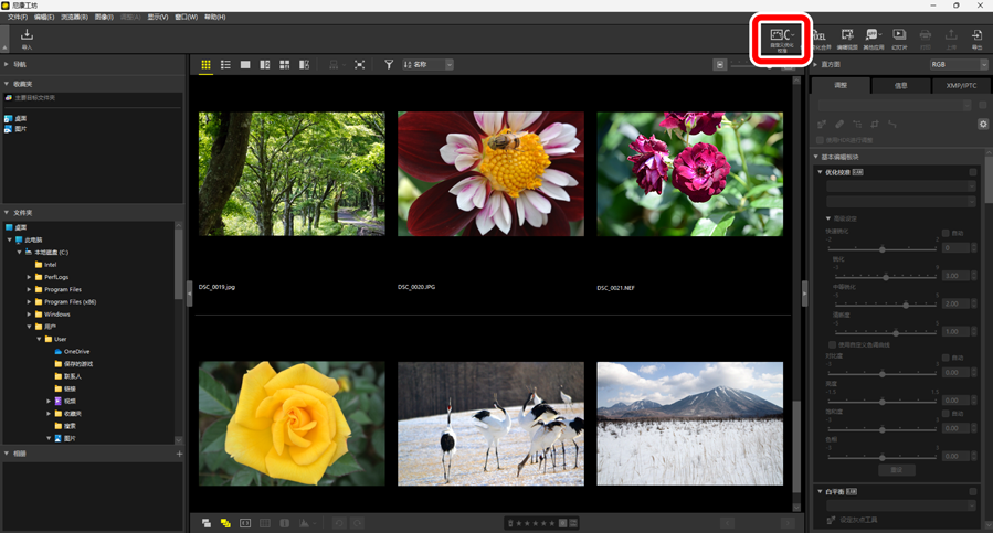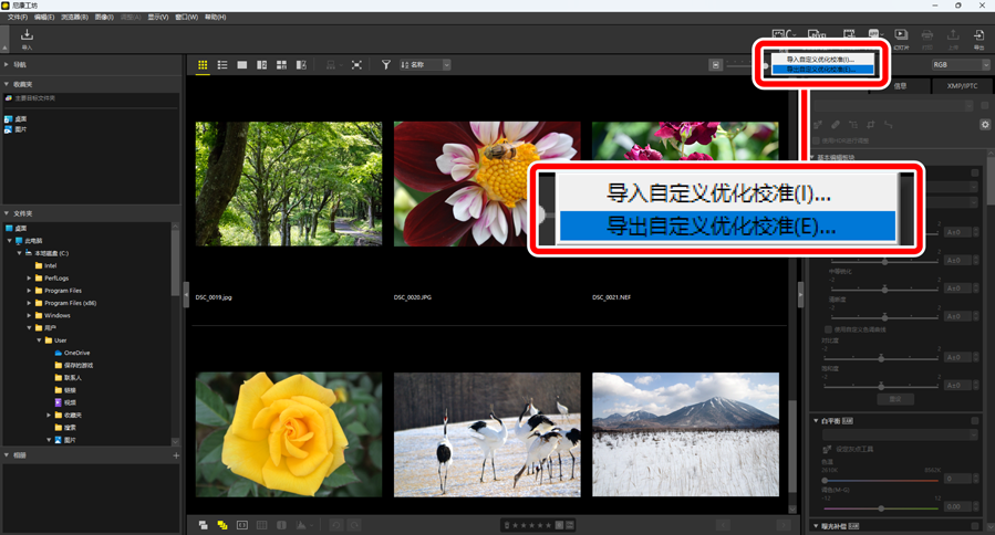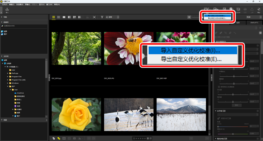 通过单击工具栏中的[自定义优化校准]按钮,您可从照相机或软件导入自定义优化校准文件并将其保存在尼康工坊中,也可以在尼康工坊中使用调整板块的[优化校准]将保存的自定义优化校准导出为文件。