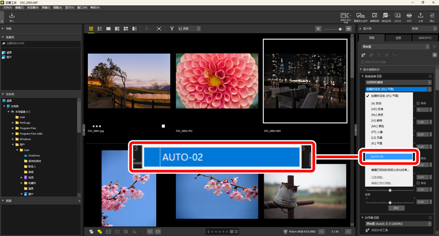 通过从调整板块的[优化校准]下的下拉菜单选择自定义优化校准,可将尼康工坊中已保存的导入自定义优化校准应用到图像上(0 优化校准工具)。