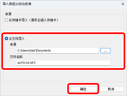 在[导入自定义优化校准]对话框中,选择[从文件导入],选择要导入的文件,然后单击[确定]。