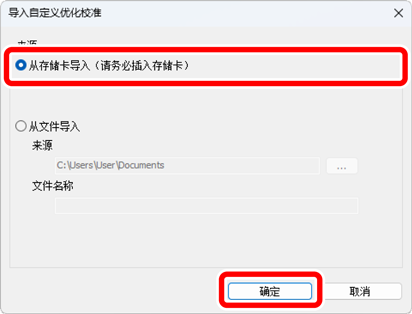 在[导入自定义优化校准]对话框中,选择[从存储卡导入(请务必插入存储卡)]并单击[确定]。