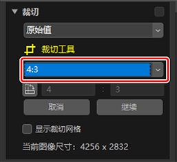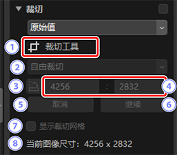 - 当前裁切尺寸。若要在文本框中直接输入尺寸,请在宽高比下拉菜单中选择[自定义]。