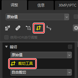 )裁切工具。您也可在调整板块顶部单击该工具的图标。