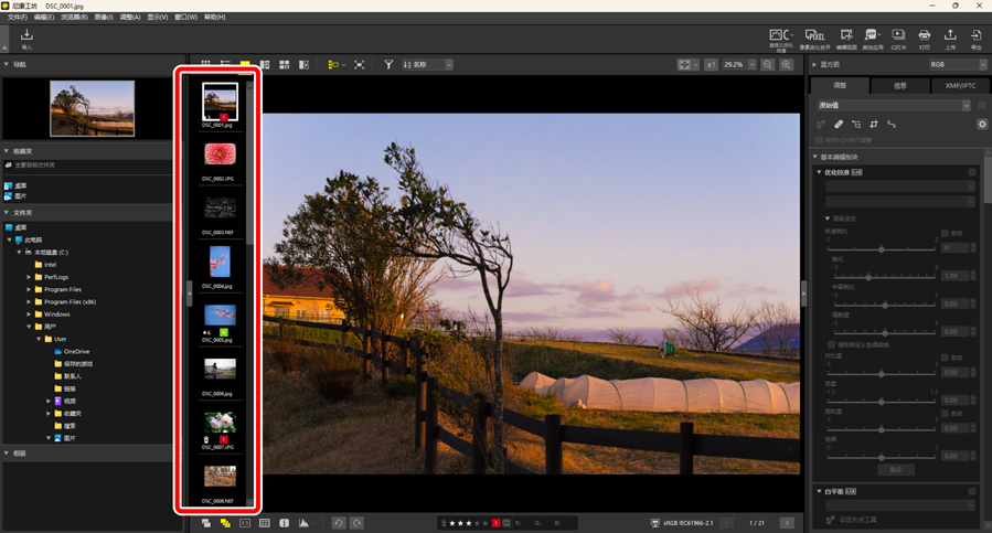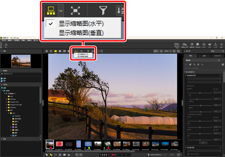 按钮可在图像查看器、“2/4张图像”和编辑前后对比视图中,查看位于查看器下方或左侧的一行或一列缩略图(“胶片显示窗格”)。