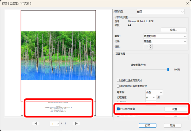 若要选择打印在各照片下方的信息,请在“打印”对话框中选择[打印照片信息],然后单击[设置]。