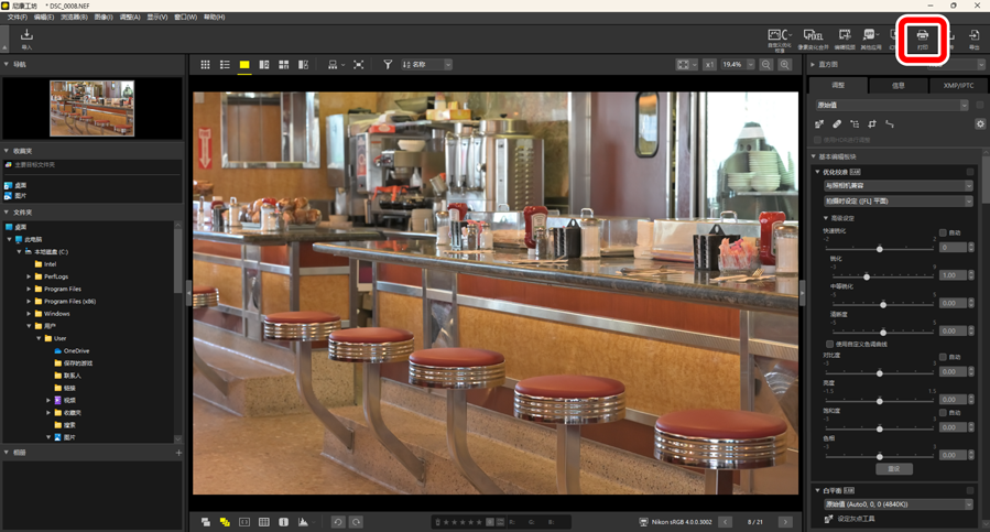 - [优先]:用于打印RAW(NEF/NRW)或合并像素变化(NEFX)照片的一个打印品质选项。选择[快速]可使用RAW图像中嵌入的预览数据进行快速打印,选择[高质量]则使用原始图像数据进行高品质输出。当[打印类型]选为[目录打印]时,仅[快速]选项可用。