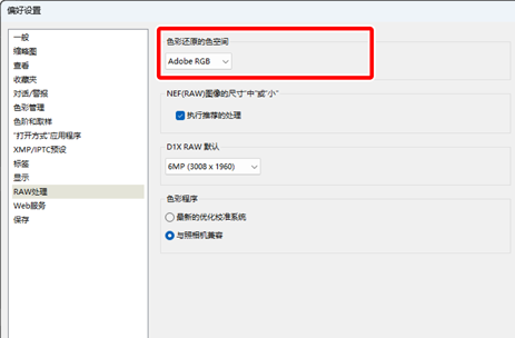 - 将选项/偏好设置对话框中的[RAW处理] >[色彩还原的色空间]选为[sRGB](0 选项/偏好设置对话框、[RAW处理]),