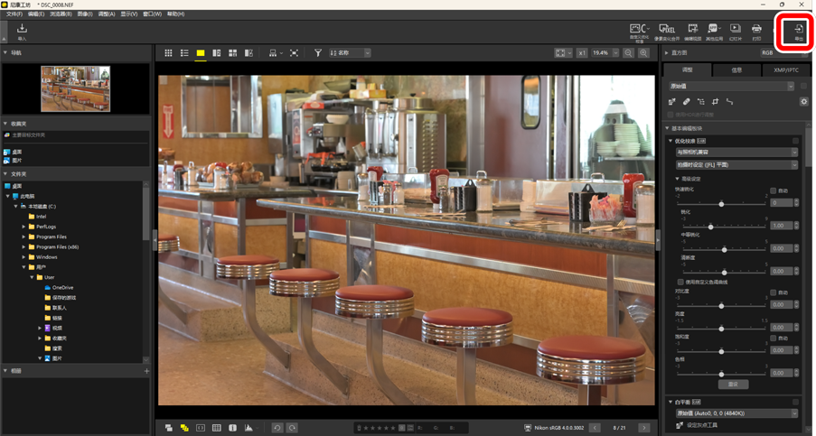 要以JPEG、HEIF或TIFF格式导出当前选择的照片,请单击工具栏中的[导出]。将RAW(NEF/NRW)照片和NEFX(合并像素变化)照片导出为JPEG、HEIF或TIFF文件,以便用于其他软件。如果需要,可以选择整个文件夹进行导出。