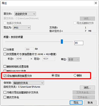 - 如果两个选项均未选择,则会在导出过程中将原始色彩配置文件嵌入照片中。