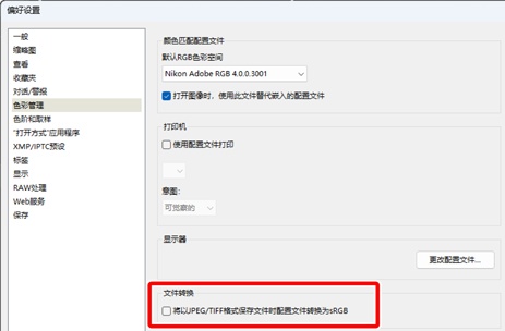 取消勾选[色彩管理]面板中[文件转换]下的[将以JPEG/TIFF格式保存文件时描述文件转换为sRGB]。