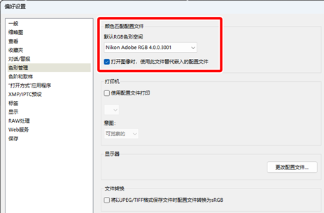 - 将选项/偏好设置对话框中的[色彩管理] >[颜色匹配配置文件]选为[Nikon sRGB 4.0.0.3002]并取消勾选[打开图像时,使用此文件替代嵌入的配置文件](0 选项/偏好设置对话框、[色彩管理])。