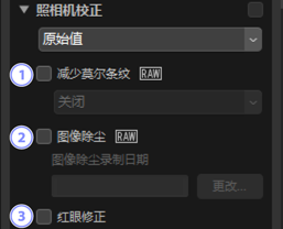 针对莫尔条纹、影像传感器上的灰尘和红眼现象进行校正。当[使用HDR进行调整]启用时不显示该工具。