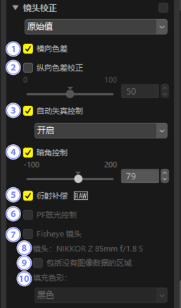 - 减少横向色差(彩色边纹和光晕)。如果是RAW照片,则会自动选择该选项。横向色差校正不适用于合并的像素变化照片。