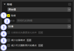 - [降噪量]:数值越高,效果越平滑,由图像“噪点”所引起的可见伪影越少。