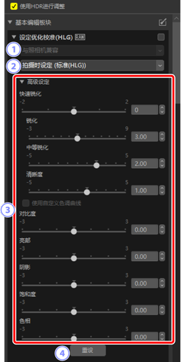 调整HDR色调范围的优化校准设定。请注意,该工具仅适用于在支持色调模式选择的照相机上启用HLG所拍摄的RAW照片或合并的像素变化照片。