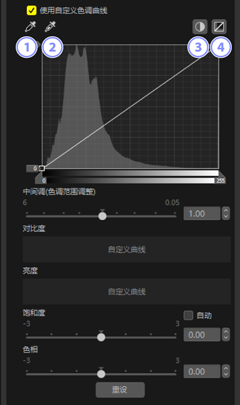 - 调整图像的总体对比度。选择较低值可获得较低对比度,选择较高值则获得较高对比度。若已使用自定义色调曲线调整过图像,则无法调整该参数。