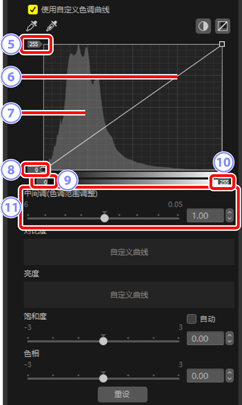 - 选择该选项可显示自定义色调曲线,让您能调整当前所选优化校准的对比度和色调曲线(亮度)(0 使用自定义色调曲线)。对于[自动]或[Creative Picture Control]优化校准或使用某些照相机拍摄的照片,无法调整这些参数。