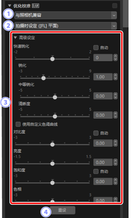 若选择使用最新优化校准的照相机所拍的照片(色彩还原处理选项固定为[与照相机兼容])或色彩还原处理设为[最新的优化校准系统]的照片,会显示以下参数。若您将优化校准选项选为[灵活颜色],请参阅“优化校准(灵活颜色)工具”(0 优化校准(灵活颜色)工具)。