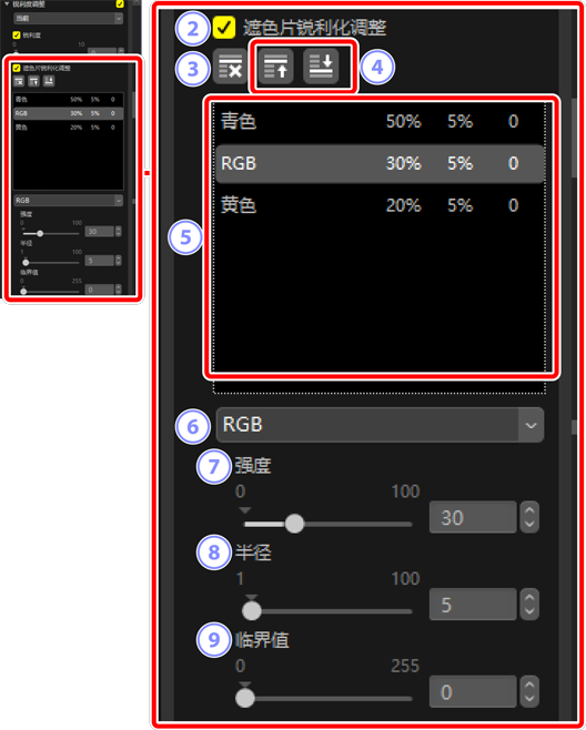 - 从遮色片锐利化调整列表中删除当前所选遮色片。