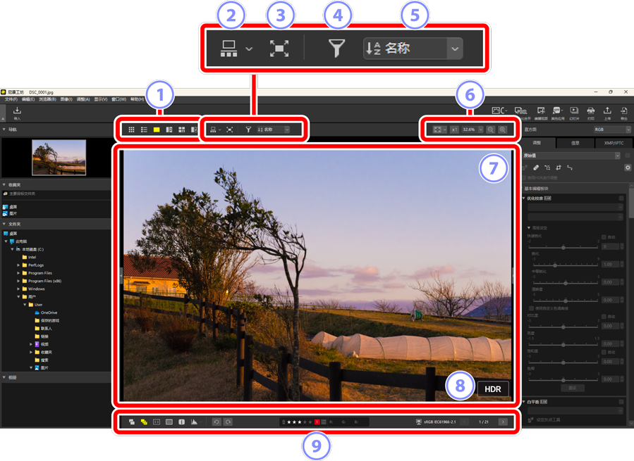照片在查看区域中显示。您可以选择查看模式,不仅包括缩略图和单画面显示,还有并排视图和编辑前后对比视图。
