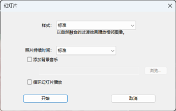 您可使用[幻灯片]对话框中的选项来控制照片的显示时长、幻灯片之间的切换方式以及其他幻灯播放设定。调整设定后,请单击[好]以开始播放。