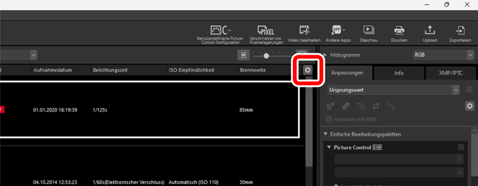 Verwenden Sie die Tasten in der oberen rechten Ecke des Anzeigebereichs, um die Anzeigegröße für die Bilder in der Bildansicht, den »2/4 Bilder«- und Vorher-und-nachher-Ansichten auszuwählen.