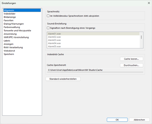 - Wenn [Signalton nach Beendigung eines Vorgangs] ausgewählt ist, gibt NX Studio einen Ton aus, wenn ein Vorgang abgeschlossen ist. Der Ton kann aus der Liste ausgewählt werden.