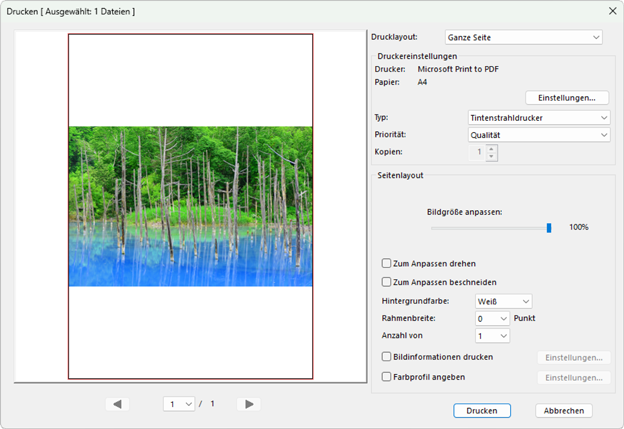 - [Ganze Seite]: Drucken Sie ein Bild pro Seite aus.