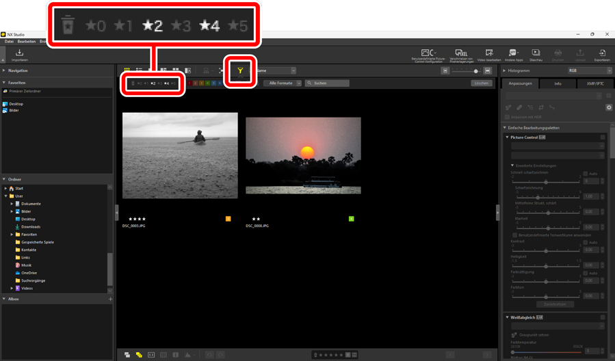 Die Bilder können nach der Bewertung gefiltert werden. Klicken Sie auf