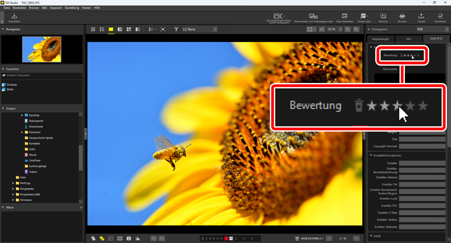 Bewerten Sie die Bilder, indem Sie unter [XMP/IPTC] > [Bewertung] in der Einstellungs/Info-Palette auf die gewünschte Anzahl der Sterne klicken. Klicken Sie auf den gleichen Stern, um die Bewertung aufzuheben (0 Die Anpassungs-/Infopalette).