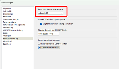 - Wählen Sie [sRGB] für [RAW-Verarbeitung] > [Farbraum für Farbwiedergabe] im Voreinstellungen-Dialogfeld (0 Das Voreinstellungen-Dialogfeld, [RAW-Verarbeitung]),