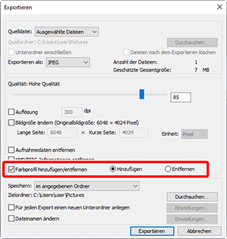 - Wenn keine der Optionen ausgewählt ist, wird während des Exports das Originalfarbprofil in die Bilder eingebettet.